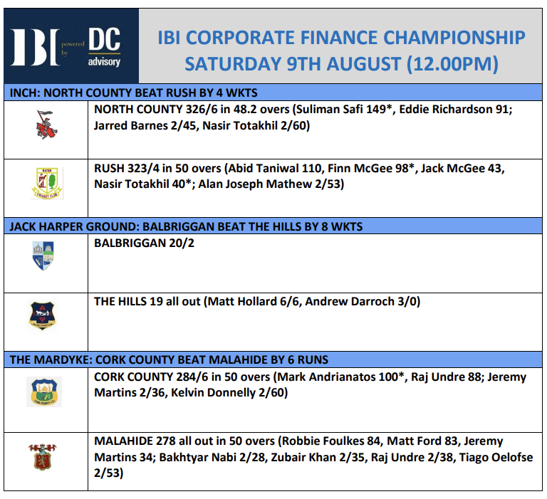 In the Championship, Cork County were indebted to an unbeaten 100 from Mark Andrianatos, and 88 for Raj Undre as they made 284/6 against Malahide. In spite of 80s for Robbie Foulkes and Matt Ford, this proved to be 6 too many, as Cork were also indebted to a slew of two-fors, with Bakhtyar Nabi, Zubair Khan, Raj Undre and Tiago Oelofse, in securing a 6 run victory.