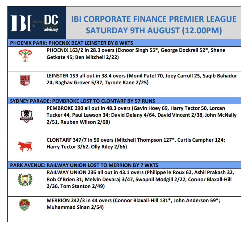 This afternoon's featured action in the IBI Corporate Finance Premier League saw Clontarf the victors in the top of the table clash against Pembroke, as they ran out 57 run winners in a run-fest in Sydney Parade.