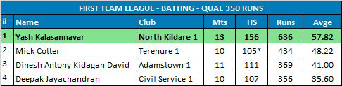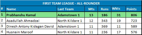 With some fine all-round performances across the First Team League, the stand-out performer was Prabhanshu Kamal (Adamstown) who finished well ahead of any of his rivals with over 800 points derived from almost 200 runs and 31 wickets for the Airlie Park side.