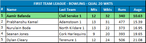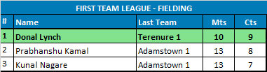 Having won this discipline at Championship level, the Terenure skipper (Donal Lynch) has again scooped this award for his catching in the field – this time at First Team League level. He finished with 9 catches just one ahead of Adamstown all-rounder Prabhanshu Kamal.