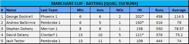 As it stands, George Dockrell (Phoenix) is in pole position to pick up the prestigious Marchant Cup for batting with an aggregate 458 runs to-date at an incredible average of 114.5 per innings.