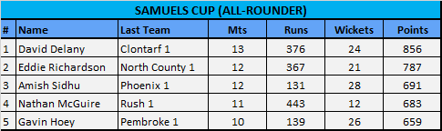 The Samuels Cup is awarded annually to the top all-rounder at Premier League level and is determined via a point system which recognises individual contributions across the season. Given the strength of his contributions to Clontarf’s success so far this season, it will be no surprise to see David Delany in a strong position to win the all-rounder cup for a third time in just 4 years (he previously won this trophy in 2022 and 2023).