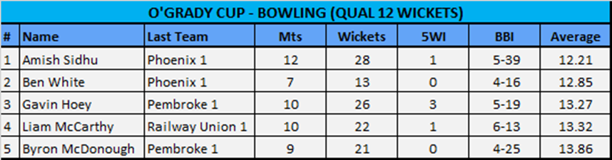 The O’Grady Cup is the equivalent award for the top bowler in the Premier League and as it stands, Amish Sidhu is well placed to bring this trophy back to The Park as well with his Phoenix team-mate (Ben White) hot on his heels – Sidhu has accumulated 28 wickets at 12.21 apiece having played almost all games whilst White’s average just 0.64 adverse to Sidhu but based on a lower level of participation to-date. Last year’s winner was Byron McDonough of Pembroke who is currently in 5th spot.