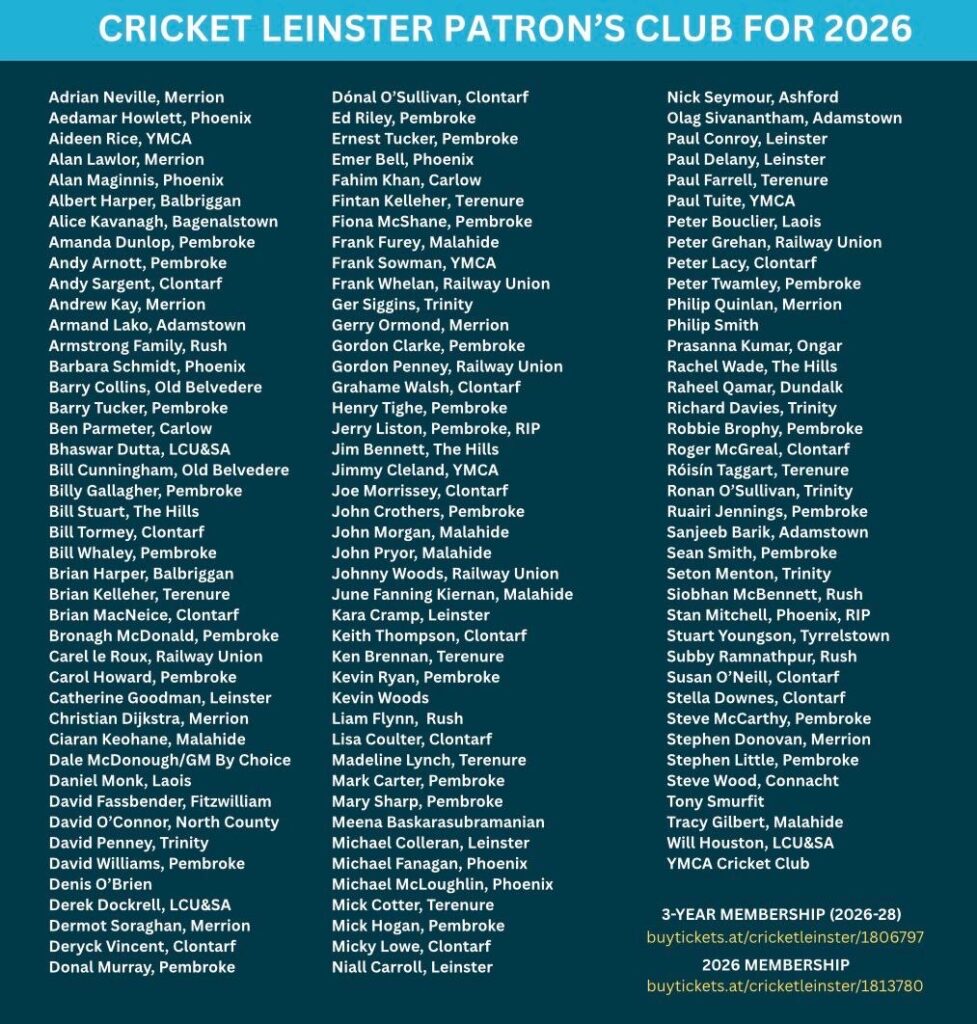 Option to have your name published as a Patron in future Cricket Leinster Annual Reports.