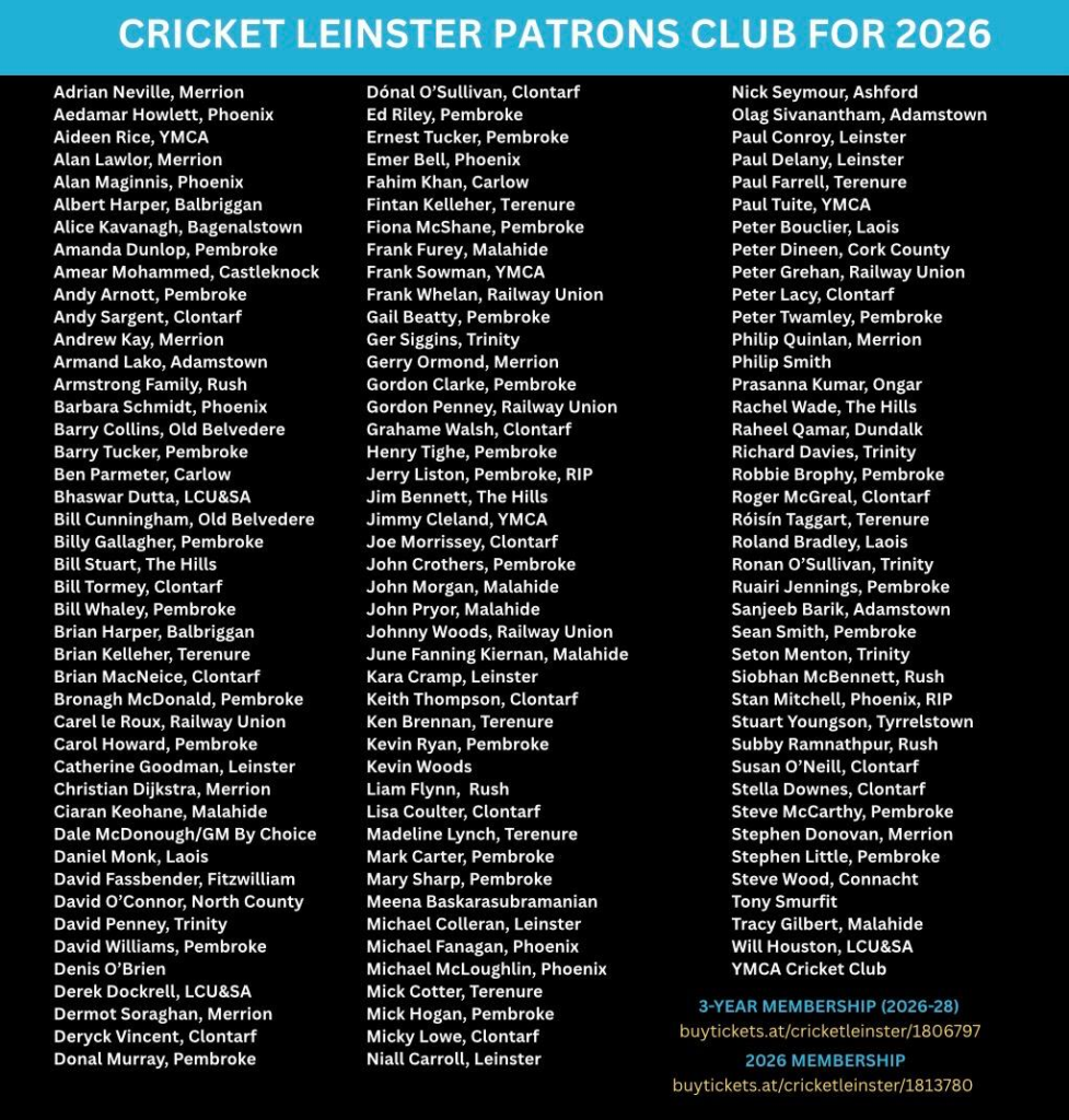 We are pleased to confirm that there are now 128 people signed up as members of the Cricket Leinster Patrons Club for 2026.