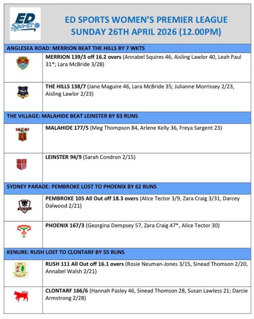 Having being set a challenging 178 for victory, the Leinster reply never really got going as they limped to 94/9 off their allotted overs. It was a disciplined performance in the field from the home side with Sarah Condron the pick of the bowlers (2/15) well supported by the Sargent sisters who shared another 3 wickets. Easy win for Malahide by 83 runs.