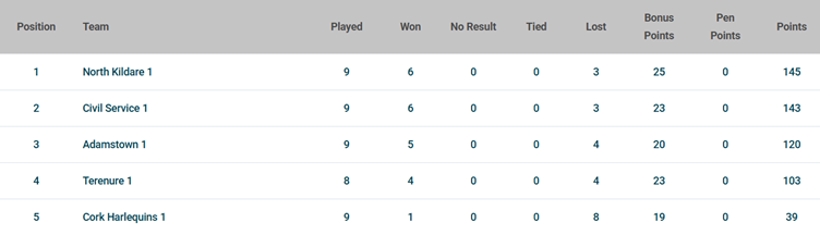 Last week saw Civil Service sensationally turn over North Kildare to set up an incredible finish to the season, they now sit just two pints short of the coveted first place spot, however are on a bye this weekend. Elsewhere Adamstown beat Cork Harlequins comprehensively to catapult themselves ahead of Terenure albeit with an extra game played.