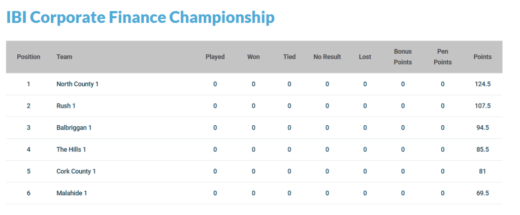 The split in the IBI Corporate Finance Premier League means that the first round of fixtures in the IBI Corporate Finance Championship are set to take place this weekend, and with three ties kicking us off, the league table sees North County at the top of the table, 17 points clear of the holders Rush. Whilst at the opposite end, Malahide are 11.5 points adrift of Cork County in last place.