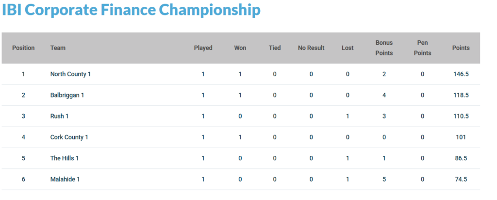 Something of a ‘moving week’ in the IBI Corporate Finance Championship last weekend saw North County beating Rush to give themselves essentially a game worth of wiggle room at the top of the table. Balbriggan leapfrogged Rush into second with a demolition job over The Hills, who in turn were overtaken by Cork County after they won a nail-biter against Malahide in The Mardyke.