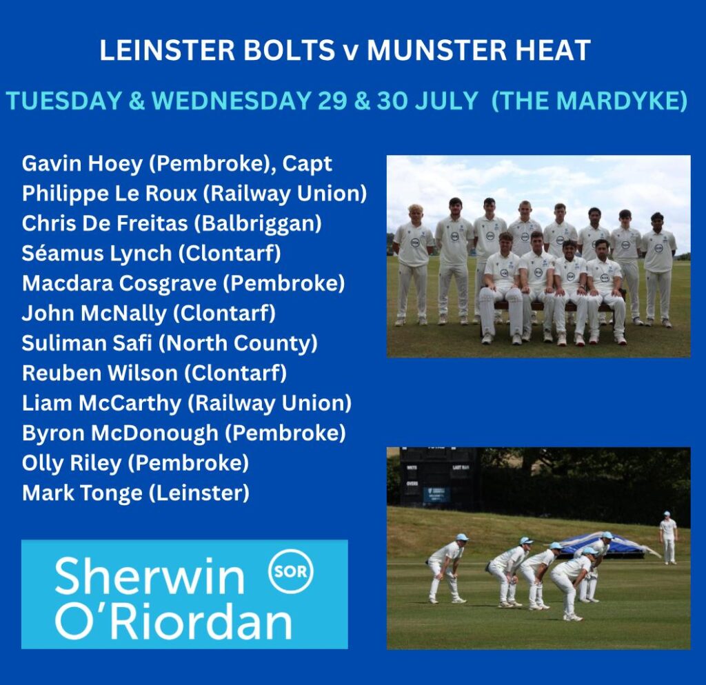 The Sherwin O’Riordan sponsored Leinster Bolts will travel to Cork to play the Munster Heat in a two-day red ball game at The Mardyke on Tuesday and Wednesday, 29th and 30th July as part of the Future Series.