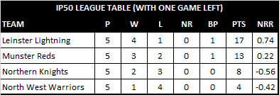 | Munster win (no bonus point) & Leinster lose | Leinster retain IP50 title on net run rate |