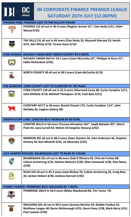 Clontarf amassed an incredible 427/4 as they ran out comfortable winners by 307 runs at the Mardyke. They got off to a solid start moving to 108 before losing Eoghan Delany for 38. That brought together David Vincent and John McNally who put on a further 107 in quick time. Losing McNally only brought Campher to the crease who blasted 114 from just 45 balls in support of an incredible 172 from Vincent. The Cork County chase never got going as they wilted in face of such an imposing challenge, McNally and Campher collected 3 wickets each as to put their side well on top, before a brace of wickets apiece for both Yash Bala and Mitchell Thompson romped Clontarf to a 307 run victory, rolling Cork County over in just 22.3 overs.