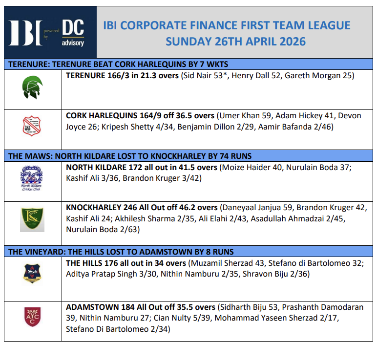 Terenure's chase was professional, as Gareth Morgan set the tone with 6 boundaries in his 25 before being dismissed by Khan who was having a good day among plenty of carnage for the away side. However from 2 down for 50, the hosts saw Henry Dall (52) and Sid Nair (53*) added 90 for the third wicket, before the skipper was dismissed, however Nair and Dónal Lynch had no issues knocking off the final 25 runs, with a 7 wicket-victory secured inside 22 overs, with the hosts securing 24 points to begin the season.
