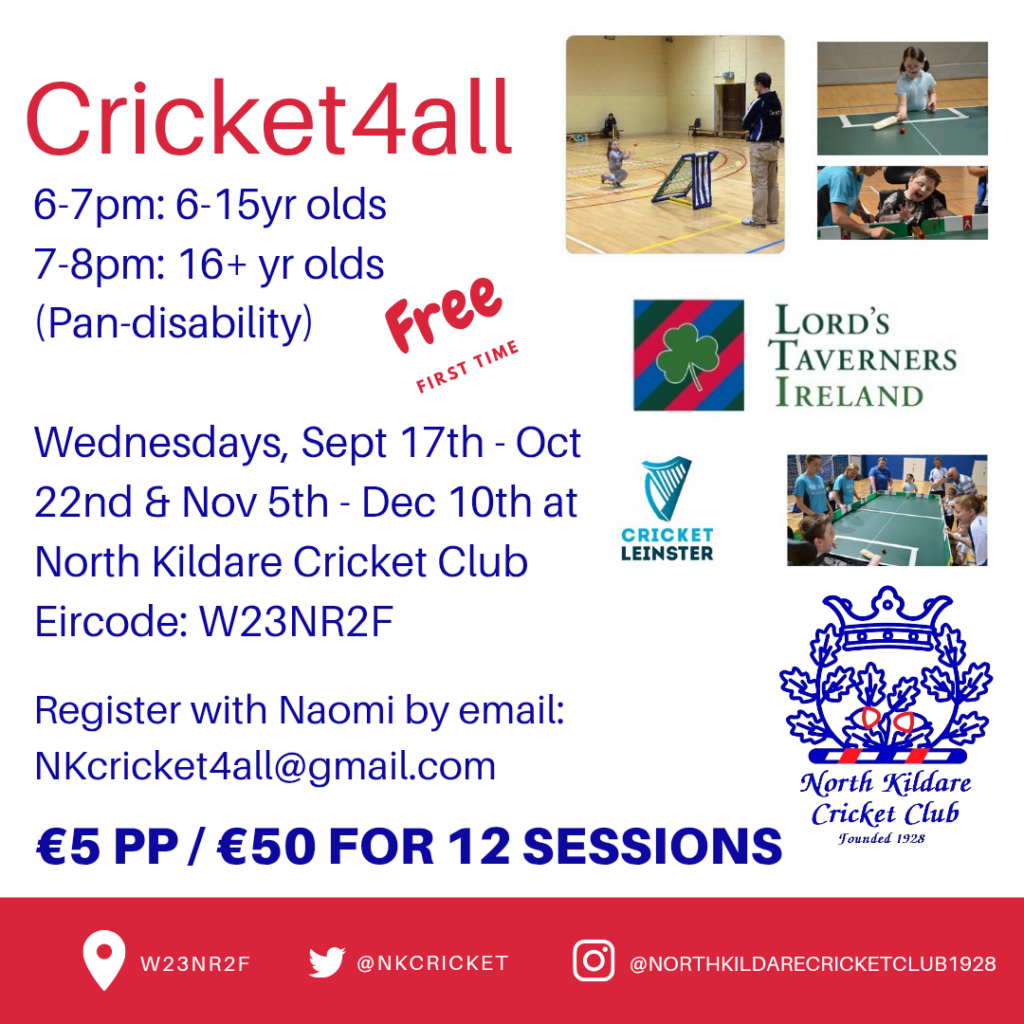 North Kildare Cricket Club is delighted to announce the return of Cricket4All, a pan-disability cricket programme designed to make the game accessible and enjoyable for everyone. Sessions begin again this Wednesday, September 17th and will run until October 22nd, before resuming again from November 5th to December 10th.