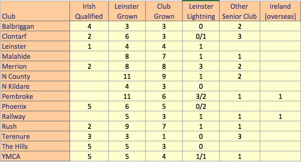 The fourth column is the number of Senior/Bolt Leinster Lightning Leinster players from a club who have been part of match day squads this year - the two figures are LL [any format] and LL Bolt only including the latter where they have not also played on the full team.
