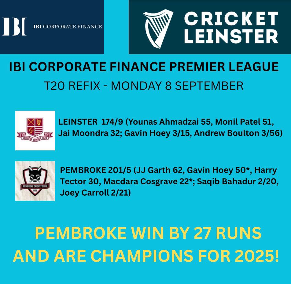 Congratulations to Pembroke, their players, coaches, officials and supporters on an excellent season, and of course, Cricket Leinster would like to extend it's thanks to IBI Corporate Finance for it's continued support of this competition over the past number of years, it is greatly appreciated.