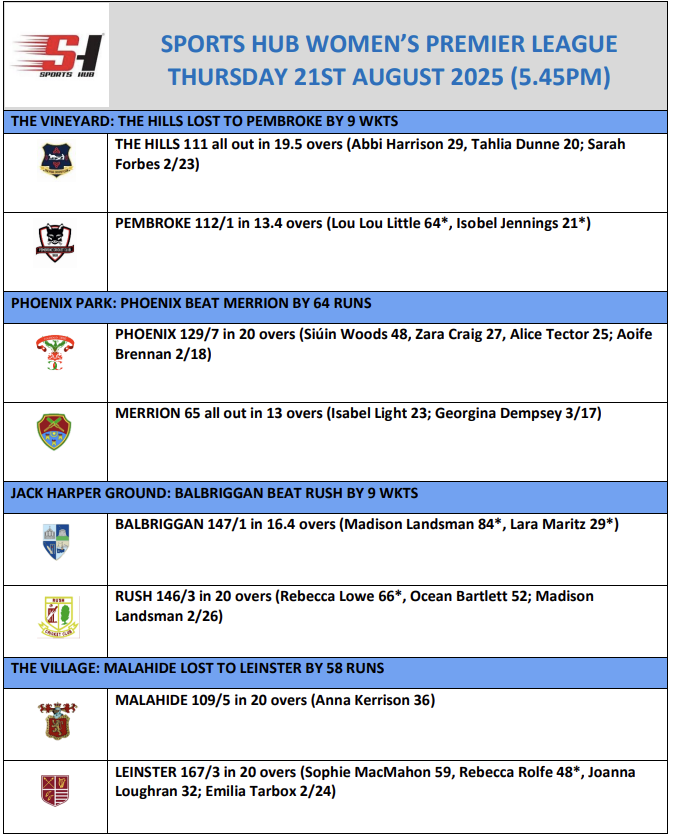 Finally, in Balbriggan, Rush would have been pleased with their effort of 146/3 in 20 overs, as Ocean Bartlett (52) supported Rebecca Lowe (66*) nicely, Madison Landsman was the pick of the bowlers with 2/26, and she didn't step out of the limelight there. The South-African hammered an unbeaten 84 from just 51 balls, sharing an unbroken stand of 116 with Lara Maritz (29*) in taking the 'Brig to victory and keeping them just ahead of Leinster in third place.