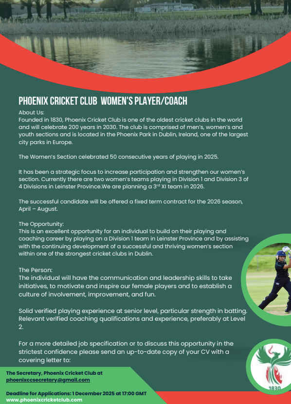 This is an excellent opportunity for an individual to build on their playing and coaching career by playing on a Division 1 team in Leinster Province and by assisting with the continuing development of a successful and thriving women’s section within one of the strongest cricket clubs in Dublin.