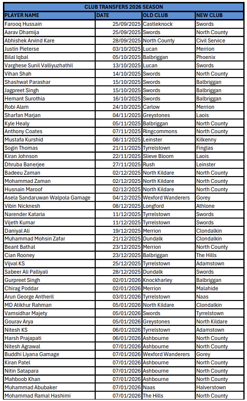Meanwhile, it's a busy time for the newly rebranded Tullamore CC, who have already seen 8 transfers in ahead of the coming season.