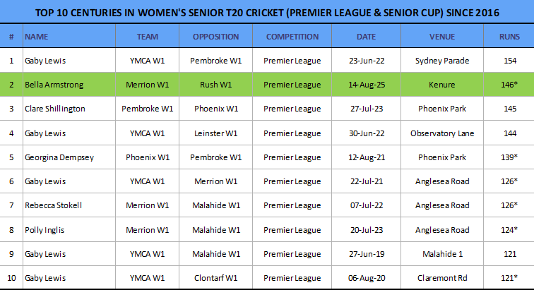 With this caveat in mind, it is still worth noting the second highest individual score in a senior T20 game. In this week’s match between Rush and Merrion at Kenure, Bella Armstrong from Merrion made 146*.