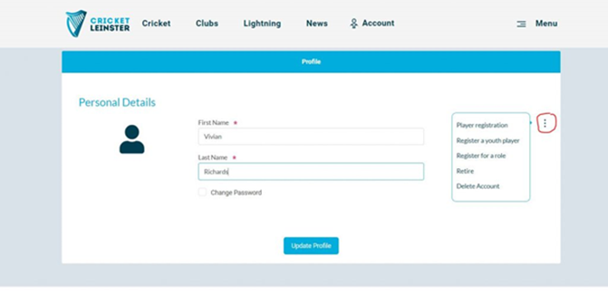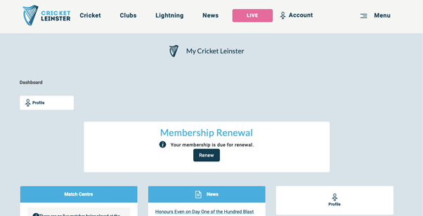 3. Press “Renew” from your profile page. If you wish to remove items from the list, then click on the “Profile” button on the dashboard. Then select “Retire” from the three dot menu button. Retire from the roles you no longer wish to fulfil (e.g., umpire, scorer, player). Then press “Renew” again.