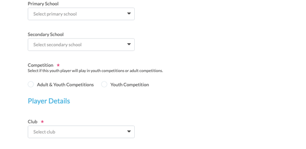 Select Adult and Youth Competitions if the youth player is going to play in ANY Open or Women’s Competitions - only select 'Youth Competitions' if he or she is ONLY going to play in Youth Competitions (U11/U13/U15/U17/U19) and definitely no Adult Competitions