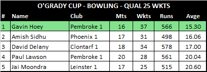 The O’Grady Cup for the top bowler in the top Division has been won by Gavin Hoey who accumulated 37 wickets for Pembroke at just 15.30 apiece. In fact, there are three spin-bowlers in the top 5 of the Premier League underpinning the value of quality slow bowling at the highest level of club cricket.