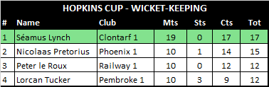 Having made the move across the Liffey in the off-season, Seamus Lynch will be pleased to have secured the Hopkins Cup at his first attempt for Clontarf CC – his 17 catches just shading the trophy from Nic Pretorius at Phoenix.