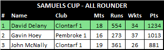 And finally congratulations to the Clontarf Captain (David Delany) who has won the Samuels Cup for the top all-rounder in the Premier League for 2025. He led his team with great character and some brilliant individual performances, none more so than his blistering 7/19 against Railway Union back in late July at Park Avenue. He last won this trophy for his performances in the 2023 season!
