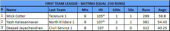 The race for the batting trophy is currently being led by Mick Cotter (Terenure) who is locked in a tight battle with Yash Kalasannavar (North Kildare) and Deepak Jayachandran (Civil Service).