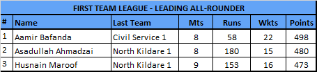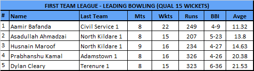 Aamir Bafanda (Civil Service) is in pole position in the bowling table for this League having already accumulated 22 wickets at just 11.32 apiece. Two North Kildare bowlers are his nearest challengers – Asadullah Ahmadzai (15 wickets at 13.8) and Husnain Maroof (16 wickets at 14.63).