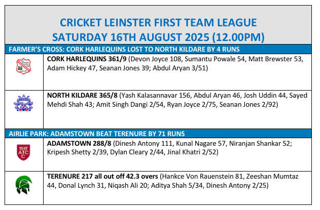 Matt Brewster (at number 7) then took up the chase with useful support from Dineth Sumanasinghe as the pair added 53 for the seventh wicket to all but seal what seemed like an improbable win at the half-way stage. Brewster was dismissed for 53 (off just 35 balls). Akhilesh Sharma then removed Sumanasinghe in the 49th over to leave Quins needing 9 off the last over. Ali Elahi held his nerve in bowling the last over as Kildare prevailed (just) by 4 runs.
