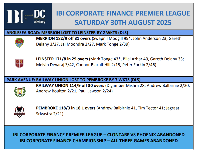 It was a truncated afternoon of action in the IBI Corporate Finance Premier League, as just two results saw Leinster and Pembroke both securing wins in shortened run-chases.