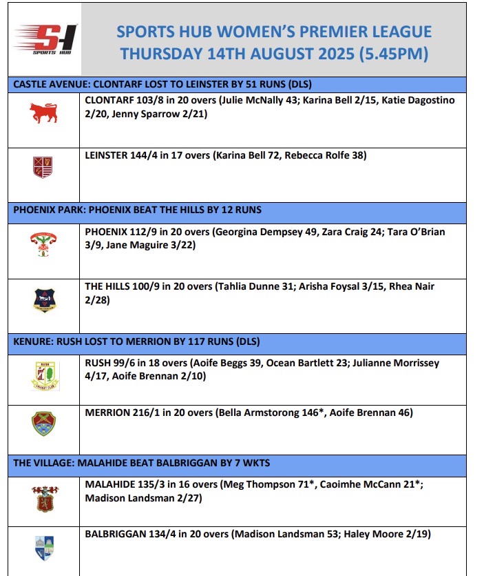 Finally in Castle Avenue, Leinster ran out 51 run winners on DLS, as after good contributions from Karina Bell (72) and Rebecca Rolfe (38) the visitors put up 144/4 in their 17 overs. A reduction saw Clontarf needing 155 for victory, however two wickets for each of Bell, Kate Dagostino and Jenny Sparrow helped the Rathmines side to a 51 run win and solidified their spot in the top 4.