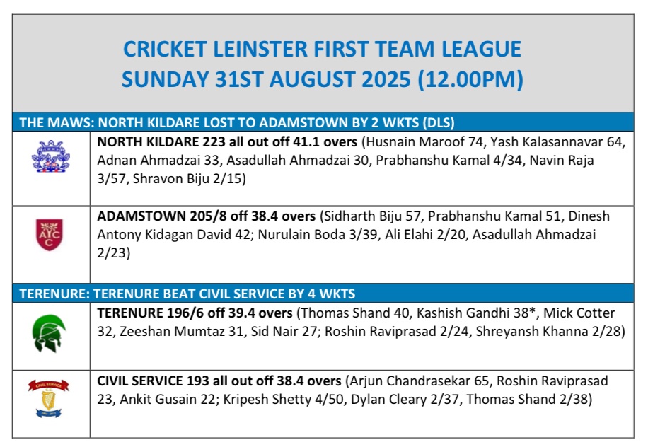 At The Maws, North Kildare won the toss and chose to bat first. The in-form Yash Kalasannavar opened the innings, got the team off to a good start and once again delivered a solid contribution (64 off 78 balls). Husnain Maroof was the other mainstay with the bat, plundering 74 (5x6, 6x4) off just 68 balls, When Maroof departed, the home side had established a solid platform (150/4 off 27 overs).
