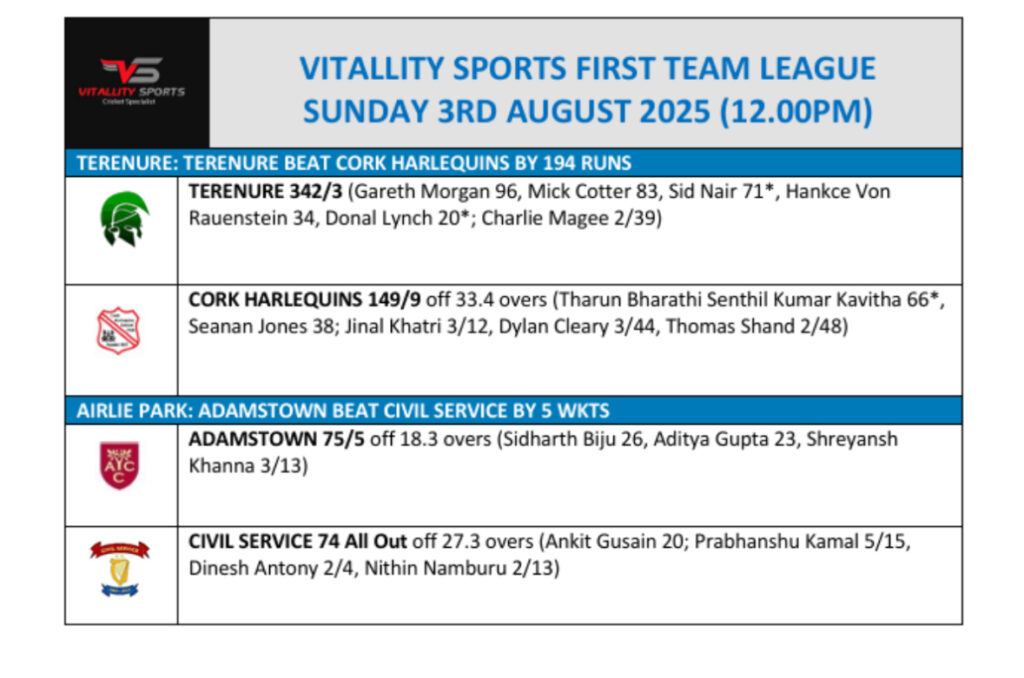 The Quins reply quickly foundered as Dylan Cleary ripped into their top order reducing the Cork side to 15/4 in just the seventh over. The experienced Seanan Jones then launched a mini counter-attack as he struck 38 off just 25 balls before becoming Thomas Shand’s second victim. Shand bowled his 10 overs unchanged (2/48). Quins were now 65/5 off 16 overs. Tharun Bharathi Senthil Kumar Kavitha (batting at 3) continued to accumulate runs at a steady pace whilst wickets continued to fall at the other end. Kavitha reached his fifty off 91 balls with the score on 121/7 after 28 overs. Jinal Khatri chipped in with three wickets for Terenure as the Quins innings subsided for 149 in the 34th over. A big win for Terenure by 194 runs.
