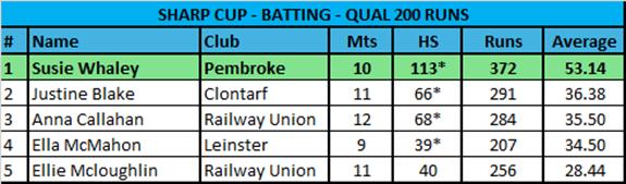 In terms of the individual awards for this league, the Sharp Cup for the top batter will be awarded this year to Susie Whaley of Pembroke (who were runners-up in the league itself). Susie was the only player to achieve an average in excess of 50 per innings and in doing so, she managed an aggregate runs total of 372 across 10 games played.