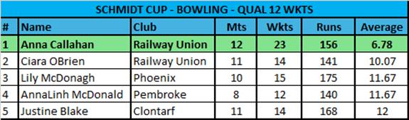 Given their league dominance, it is no surprise that the top bowling award for this league is going to Anna Callahan of Railway Union who took 23 wickets at a miserly average of 6.78 per wicket. Anna was closely followed by the highly experienced Ciara O’Brien who contributed 14 wickets to her club’s success this year at an average of just 10.07 per wicket. Congrats to Anna Calahan who will receive her trophy on the main stage in the Mansion House in January (along with all other winners).