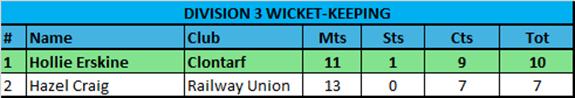 The wicket-keeping trophy for Division 3 has been won by Hollie Erskine of Clontarf who claimed 10 dismissals across the season – well done to Hollie on this success.